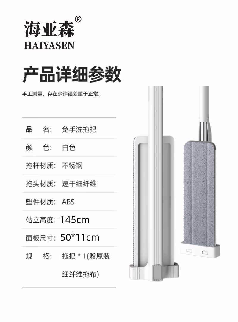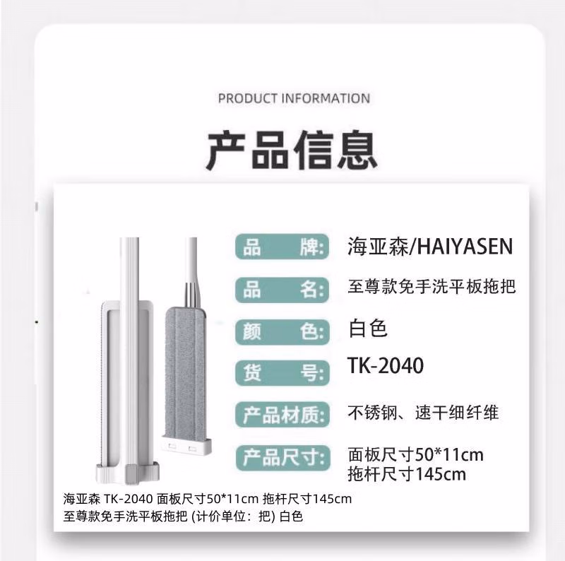 海亚森 TK-2040 面板尺寸50*11cm 拖杆尺寸145cm 至尊款免手洗平板拖把 (计价单位:把) 白色