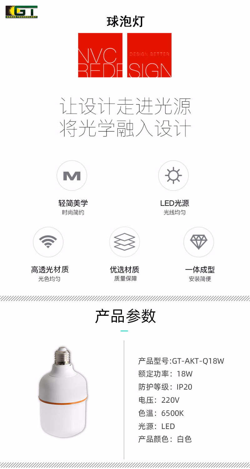 吉特(GT) GT-AKT-Q18W 18W IP20 电压220V 色温6500K LED 球泡灯 (计价单位:个) 白色