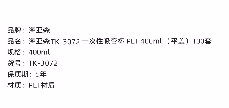 海亚森 TK-3072 PET 400ml (平盖)100套/箱 一次性吸管杯 一次性杯 100.00 个/箱 (计价单位:箱) 透明色