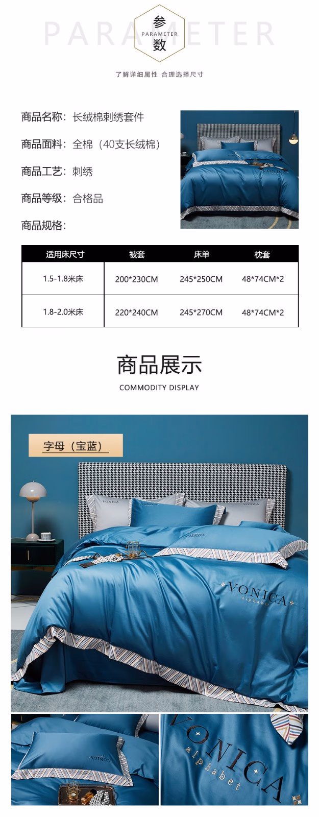 弗切尔珀榕 FQM0210073 /200*230cm长绒棉纯棉加密刺绣四件套 床上套件 (计价单位:套) 宝蓝