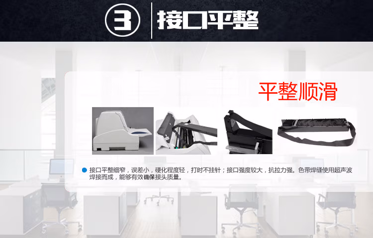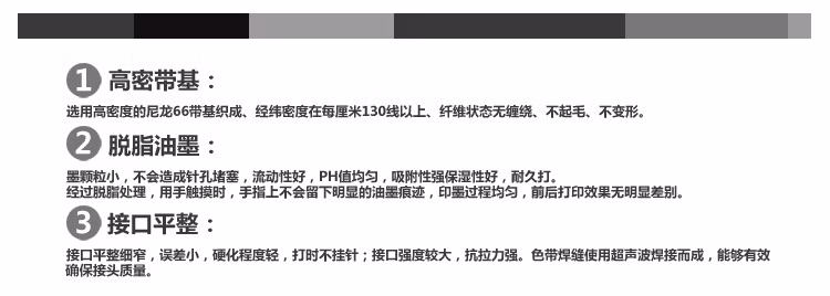 (1)、优良模具注塑成型带框及传动部件,与带芯高度协调、适配,确保打印时走带顺畅,不会损伤打印机部件。(2)、产品注塑均采用全新ABS塑料粒子,其它配件经过层层检验、测试。(3)、打印黑度好,易复印,适合东方人视觉感观特点。 (4)、产品足米尺寸,人性化设计,使用方便。(5)、 严格控制产品质量,进行全性能指标的测试,确保产品高品质。