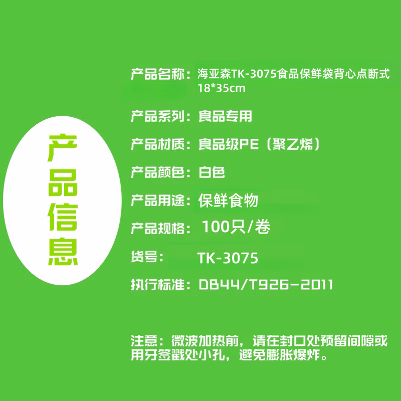 海亚森 TK-3075 18*35cm 背心点断式 食品 保鲜袋 100.00 个/卷 (计价单位:卷) 透明色