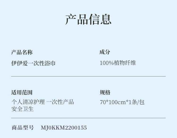 • 商品名称:伊伊爱 MJ0KKM2200155 一次性浴巾5包一组装 1条/包 100包起订