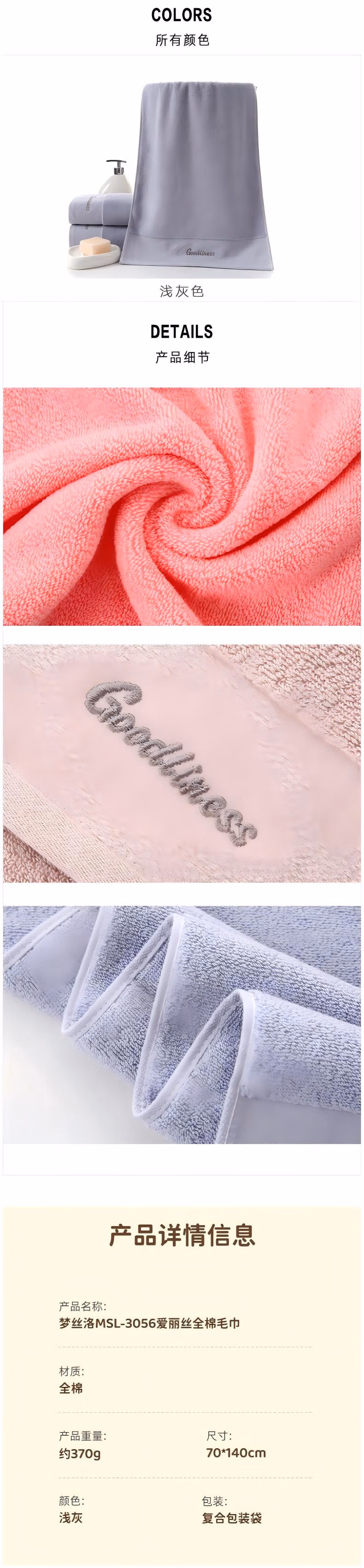 梦丝洛 MSL-3056 70*140cm 370g 爱丽丝全棉浴巾 毛巾 (计价单位:条) 灰色