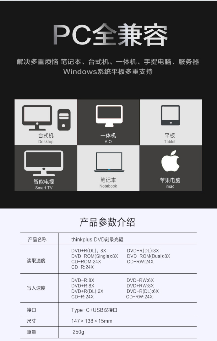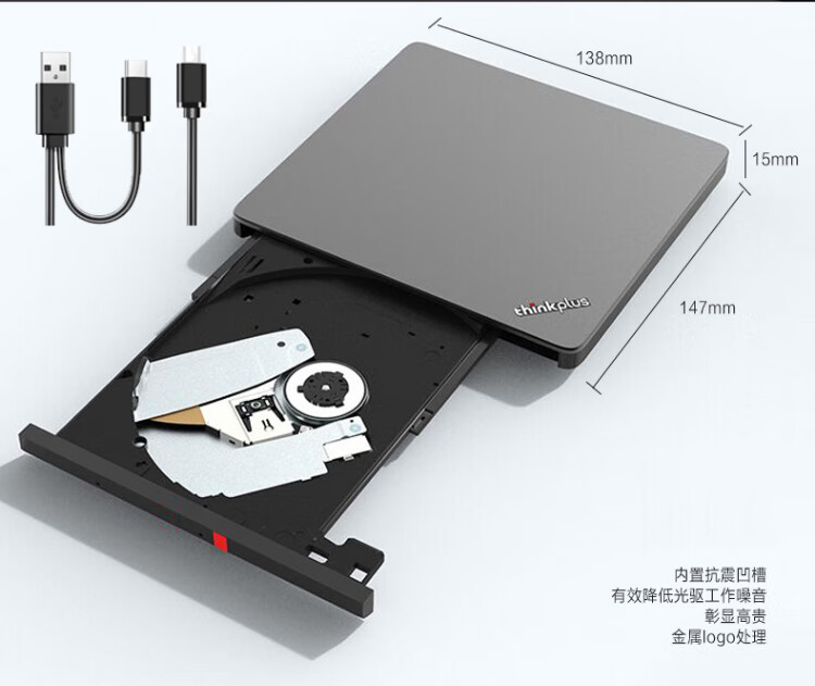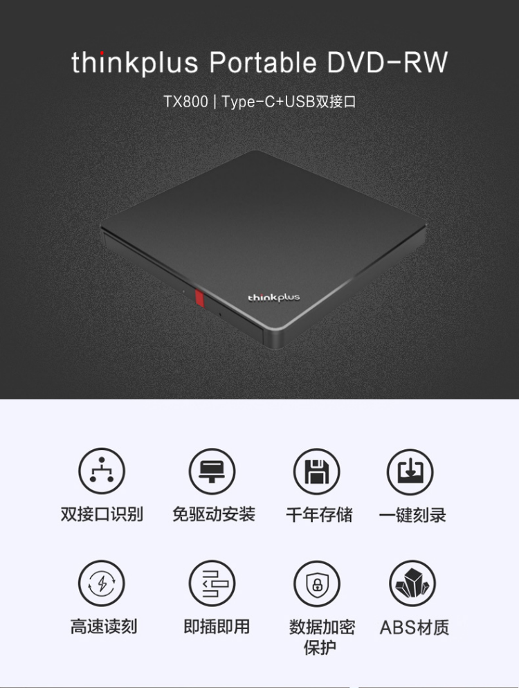 联想(Lenovo)TX800 外置光驱 超薄外置DVD刻录机 24倍速 高速移动光驱 Type-C+USB双接口 单位:个