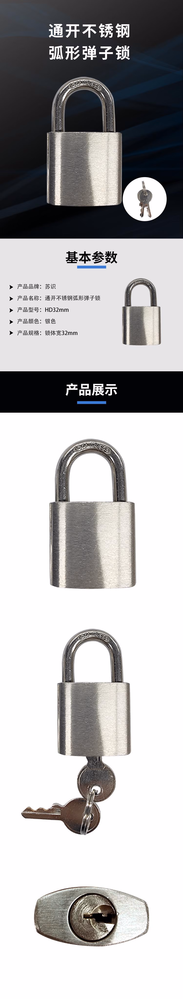 苏识 HD32mm 通开 不锈钢弧形弹子锁 (计价单位:个) 银色