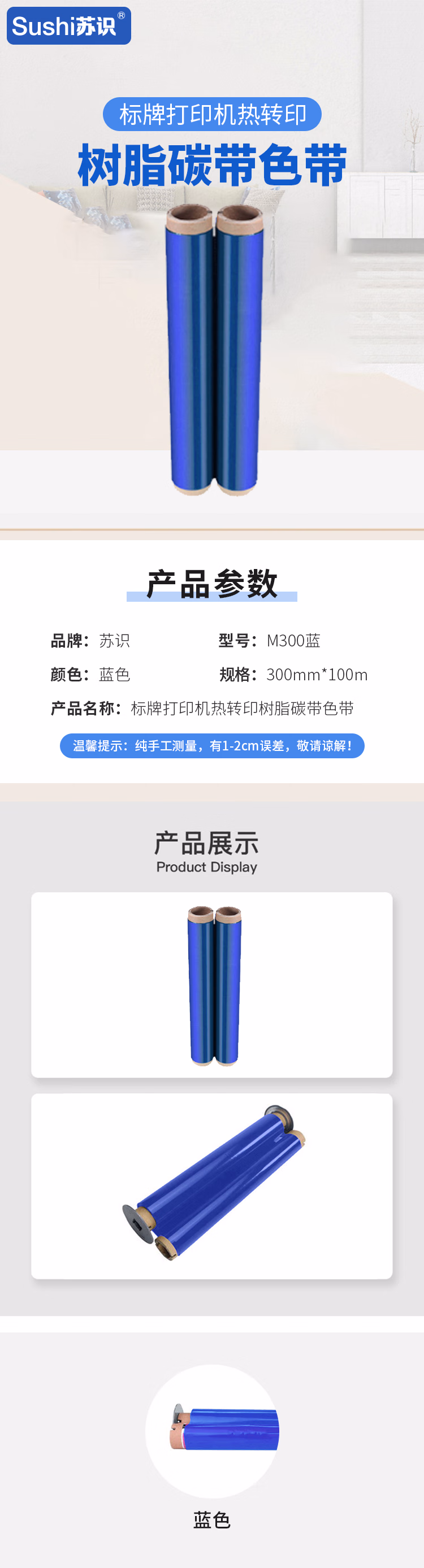 苏识 M300蓝 300mm*100m 标牌打印机热转印树脂碳带色带 1.00 个/盒 (计价单位:盒) 蓝色