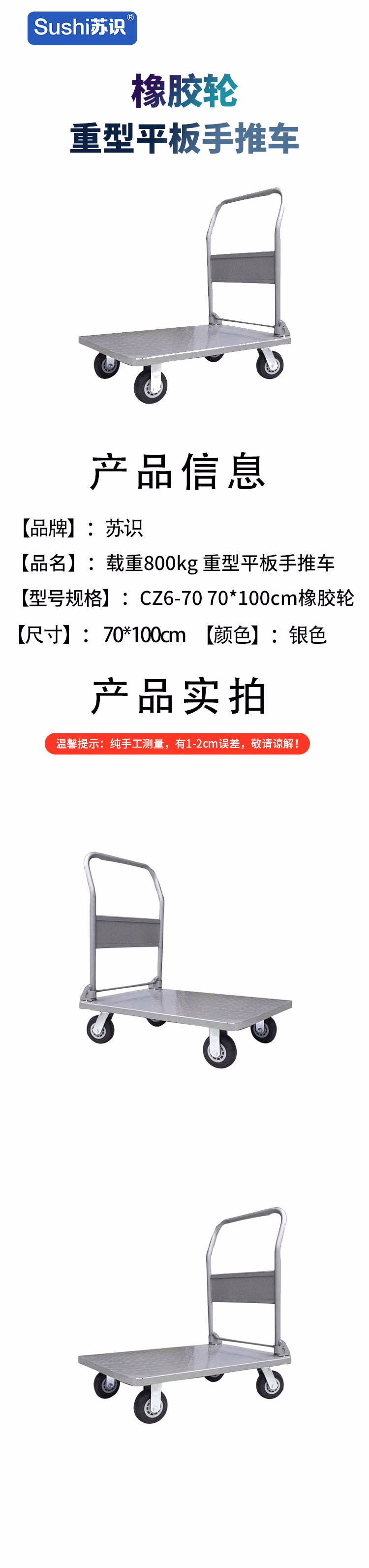 苏识 CZ6-70 70*100cm橡胶轮 载重800kg 重型平板手推车 (计价单位:辆) 银色