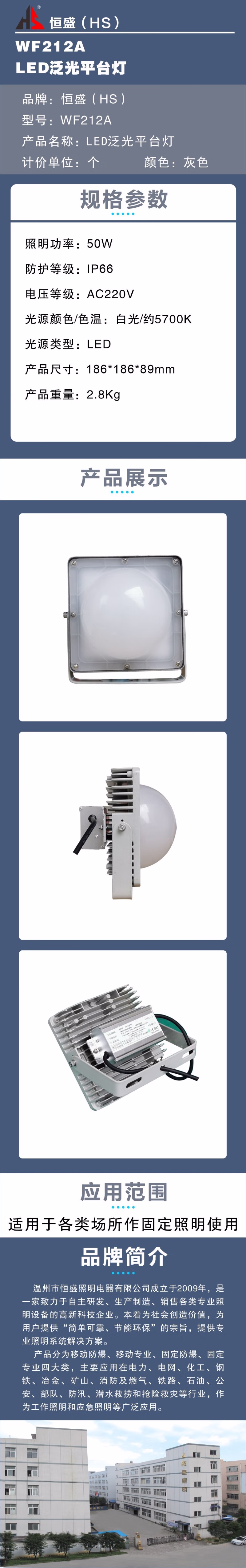 恒盛(HS) WF212A 50W、IP66、电压等级:AC220V、白光/约5700K、LED LED泛光平台灯 (计价单位:个) 灰色