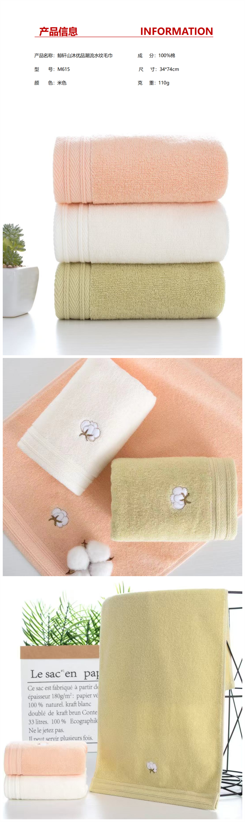鲸轩 M615 34*74cm 山沐优品 毛巾 (计价单位:条) 米色