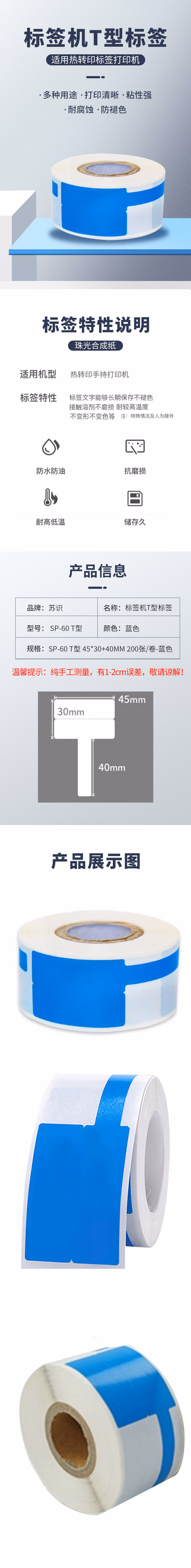 苏识 SP-60 T型 45*30+40mm 200张/卷-蓝色 标签机T型标签 1.00 盒/卷 (计价单位:卷) 蓝色