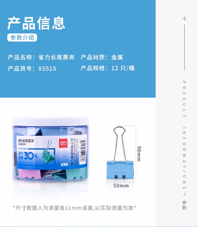 得力(deli) 8553S 24只/筒 省力票夹 长尾夹 1.00 盒/筒 (计价单位:筒) 混色