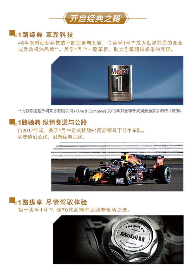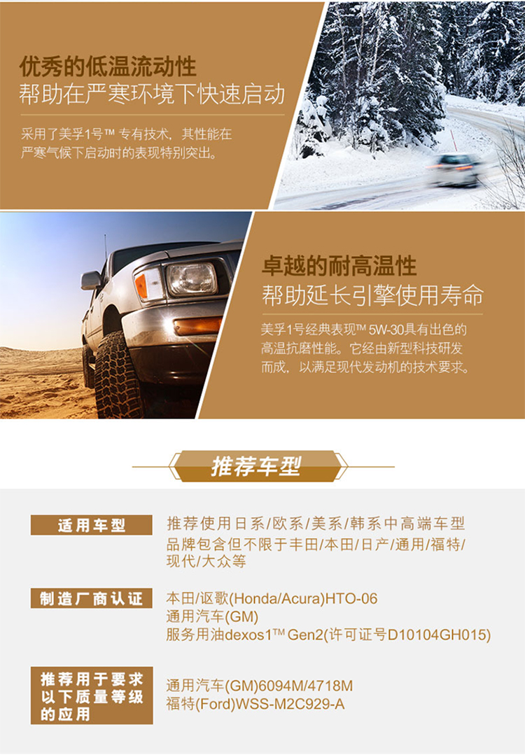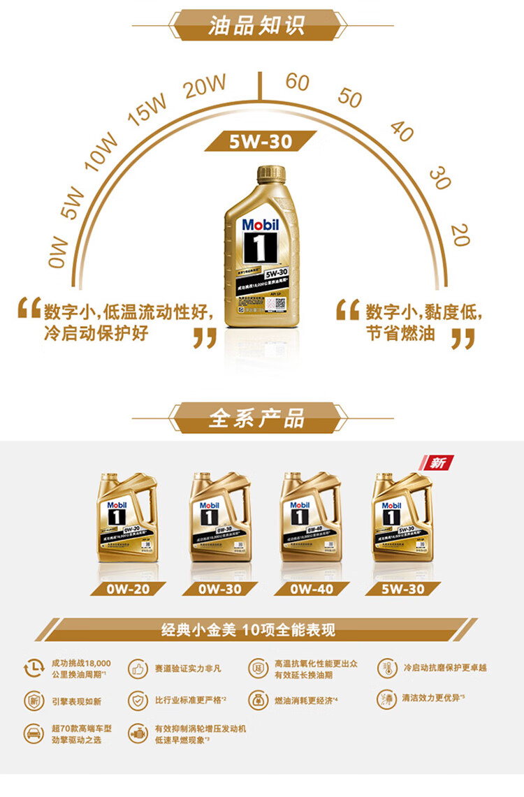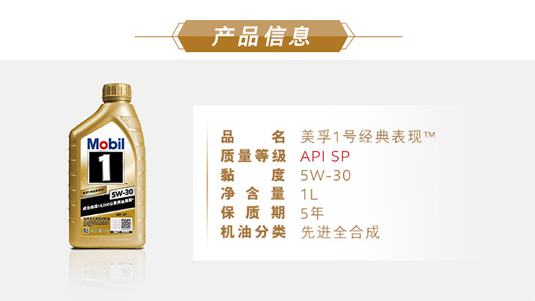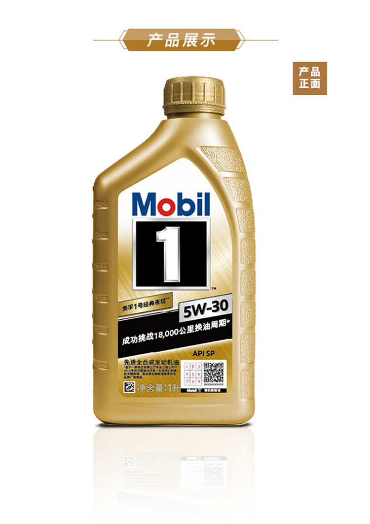 美孚(Mobil)金装美孚1号 全合成机油 5W-30 SP级 1L 汽车保养 单位:瓶