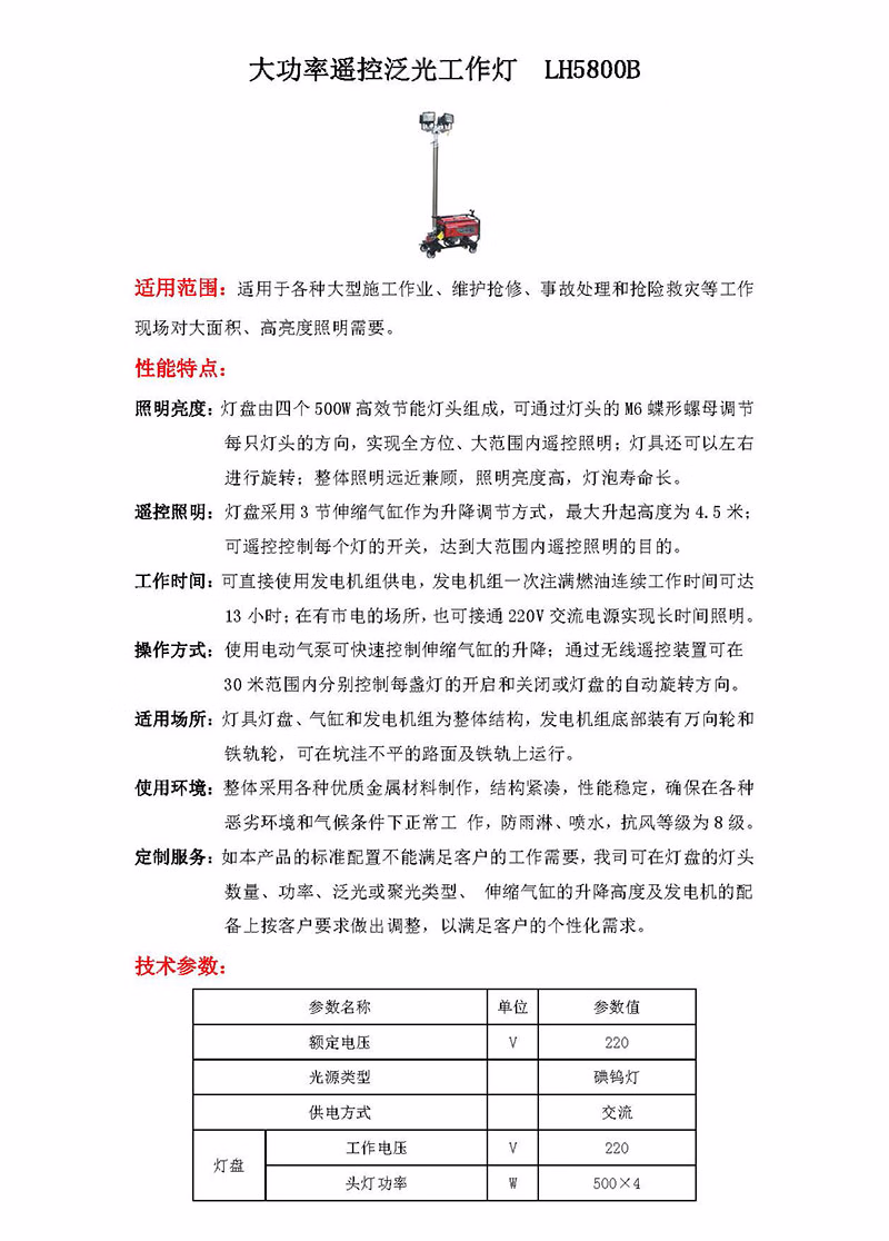 • 商品名称:LH5800B 大功率遥控泛光工作灯 4×500W 碘钨灯 冷光 220V IP65 台 红色