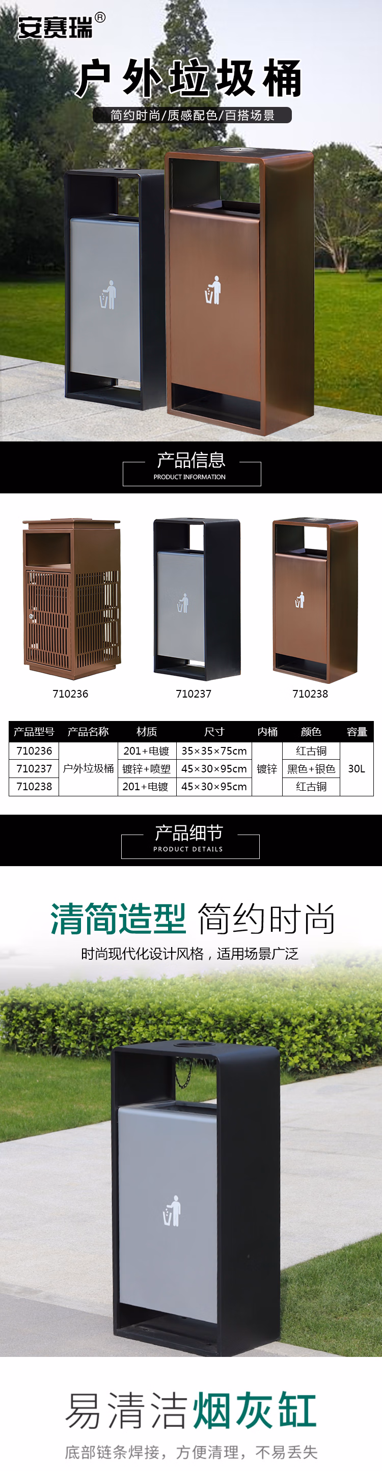 安赛瑞 710237室内外物业街道校园分类垃圾箱 30L 户外垃圾桶 (计价单位:个) 黑色+银色