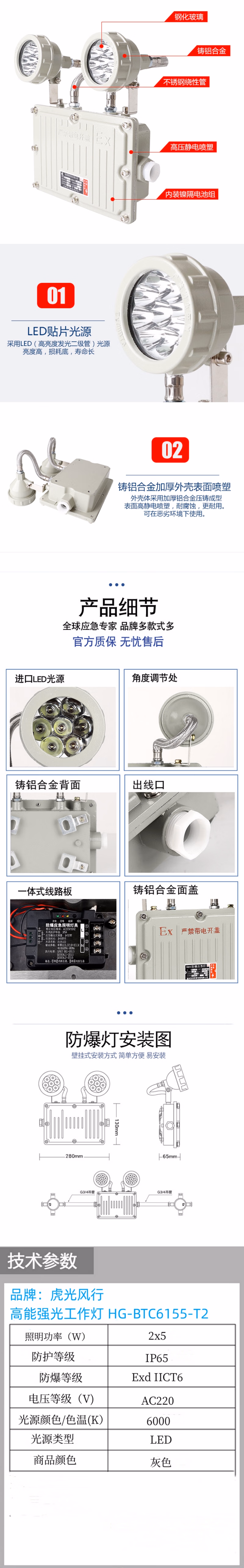 虎光风行 HG-BTC6155-T2 照明功率2x5W 防护等级IP65 防爆等级Exd IICT6 电压等级AC220V 光源颜色/色温6000K 光源类型LED 高能强光工作灯 (计价单位:盏) 灰色