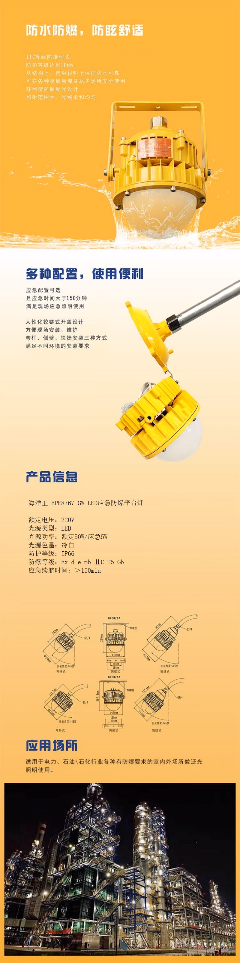 海洋王 BPE8767-GW 额定50W/应急5W IP66 Ex d e mb ⅡC T5 Gb 续航时间应急续航时间>150min 220V 冷白 LED LED应急防爆平台灯 (计价单位:盏) 黄色