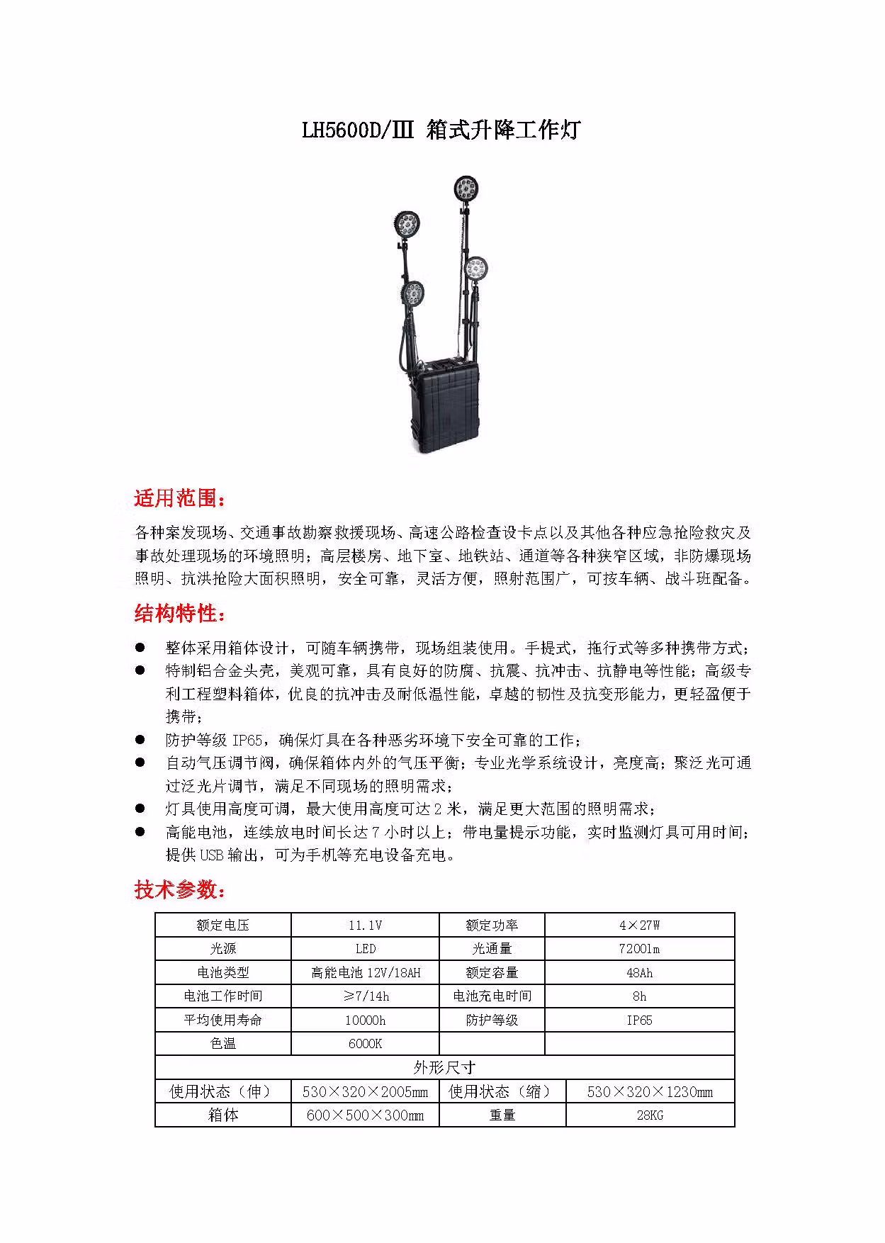 • 商品名称:LH5600D/III 箱式升降工作灯 4×27W 11.1V 14h 冷光 IP65 (套) 黑色