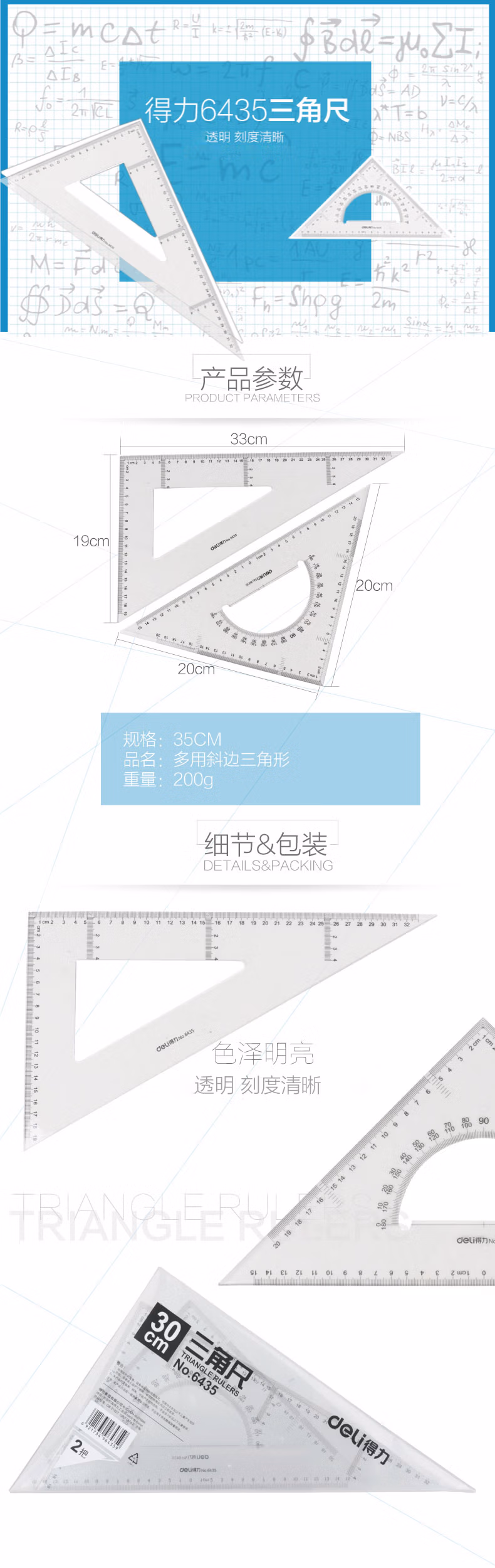 • 商品名称:得力(deli)塑料三角尺直尺子 三角板量角器 学生文具 居家学习用品 6430 30cm
