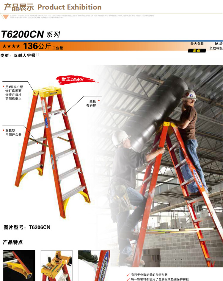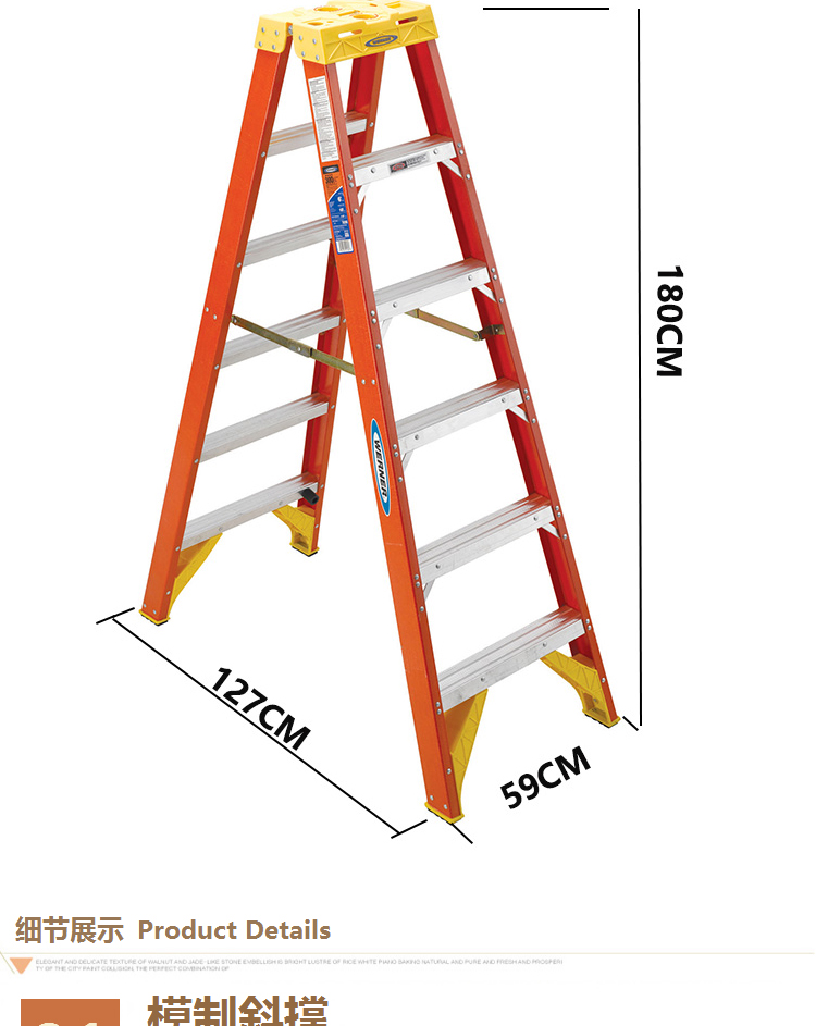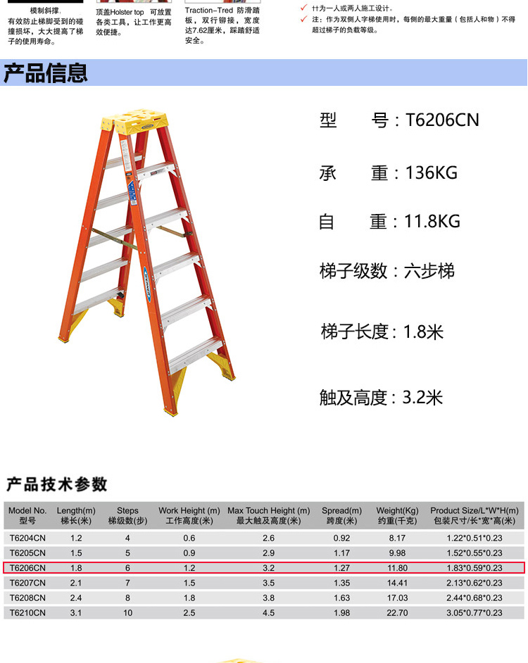 稳耐6步玻璃钢双侧人字梯 梯长1.8米型号T6206CN 承重136kg 单位:把