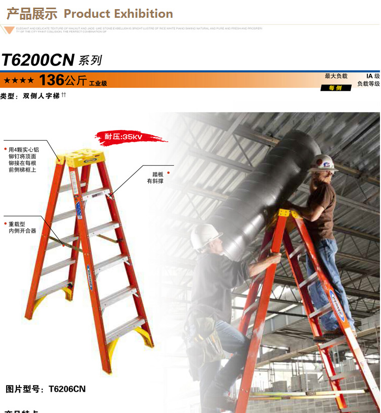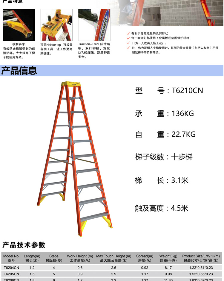 稳耐10步玻璃钢双侧人字梯 梯长3米型号T6210CN 承重136kg 单位:把