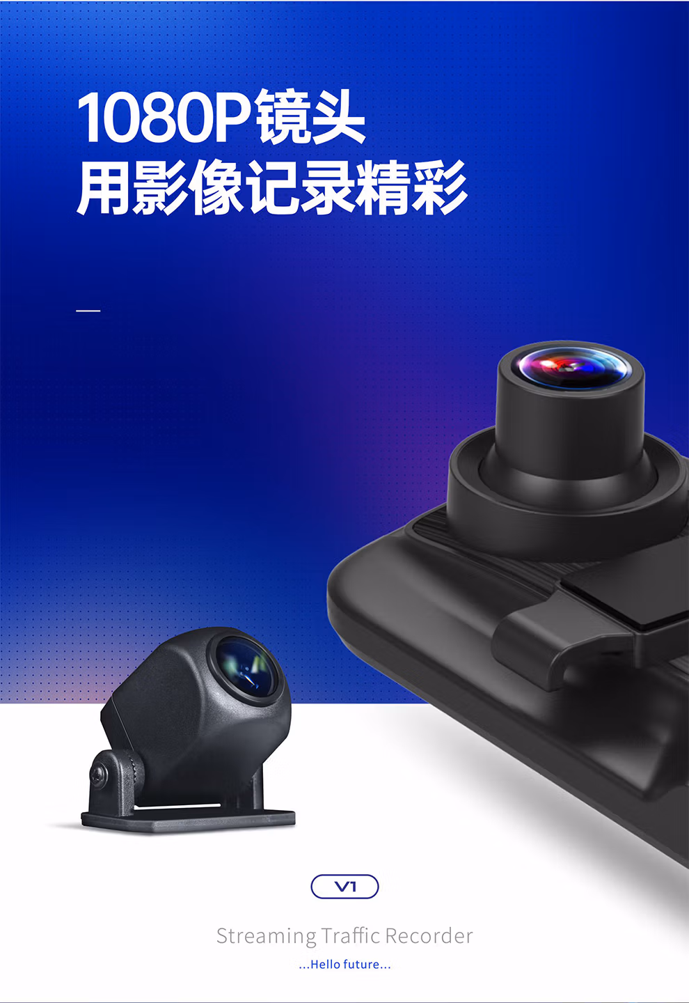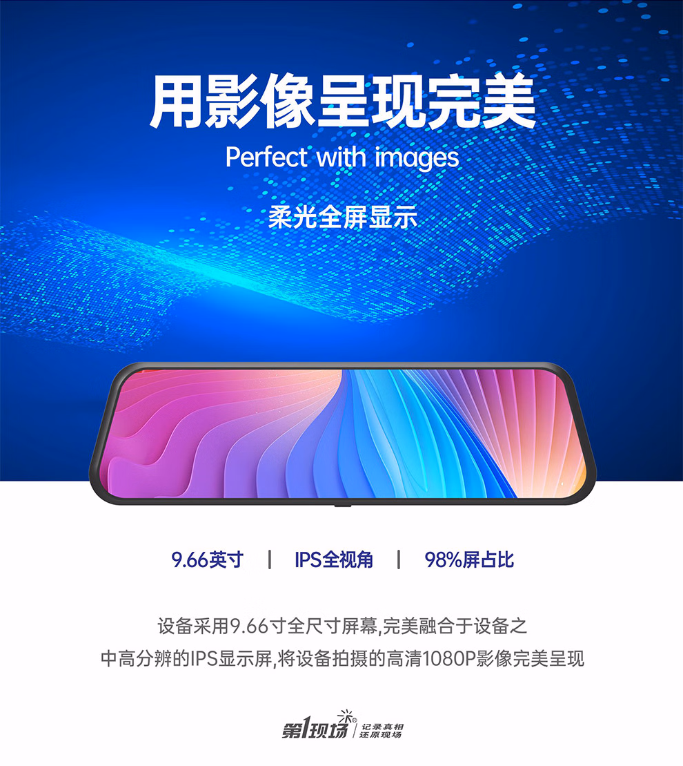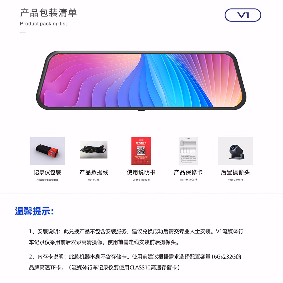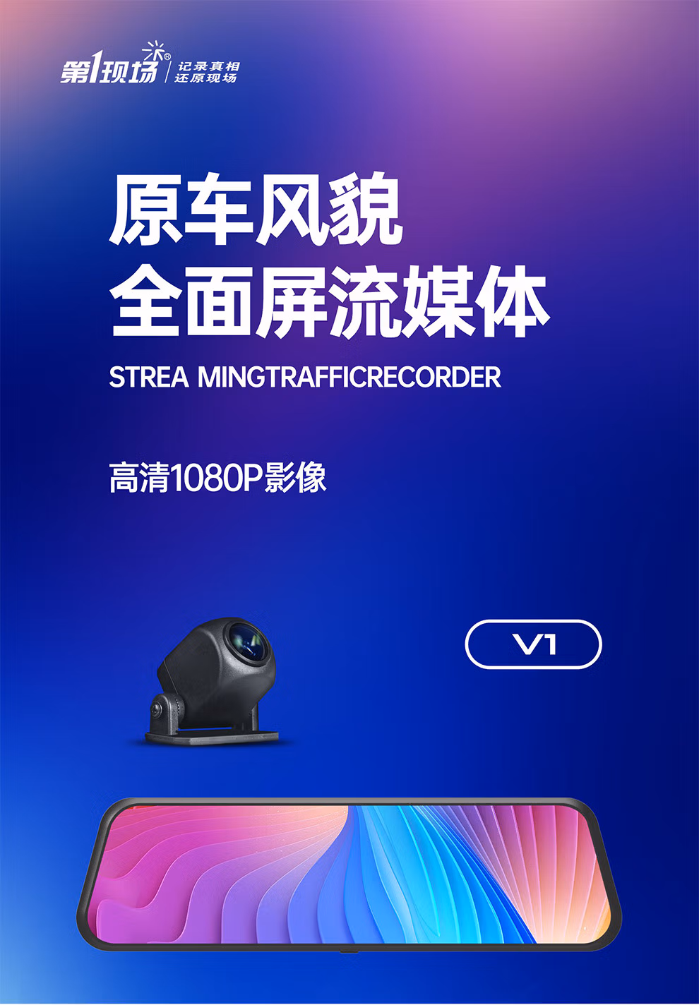 第1现场V1流媒体行车记录仪后9.66英寸触摸全面屏前后双录自动循环录影倒车影像24小时停车监控 官方标配+64G内存卡