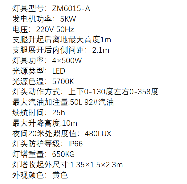 晫安联 ZM6015-A 4×500W LED IP66 220V 续航25h 10米 5700k 全方位自装卸移动照明灯 (计价单位:台) 黄色