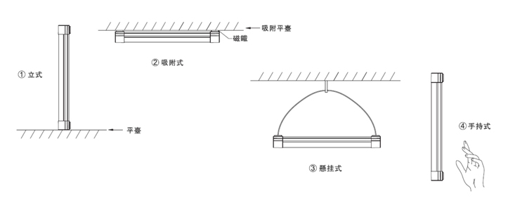 1、 使用时,轻按灯具一端的开关首次启动低亮、按第二次开启中亮照明,按第三次开启高亮照明;按第四次则关闭。任何状态下,按住约2秒则进入频闪光功能;