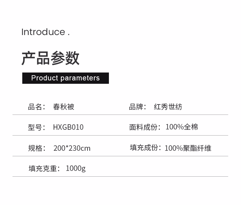 • 商品名称:红秀世纺HXGB010春秋被200*230cm 全棉 (计价单位:条) 白色