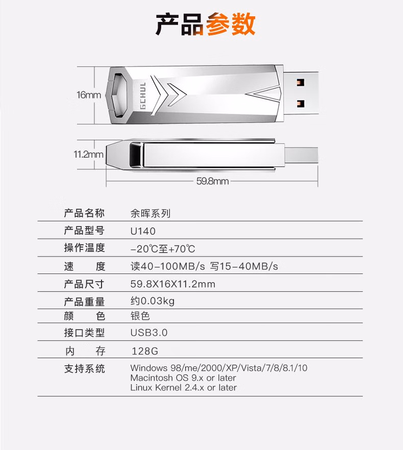 • 商品名称:杰储(GCHUL)U140 余晖系列 USB3.0 U盘/优盘 (计价单位:个) 银色 128G