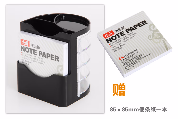 购买得力9133笔筒赠送85×85mm便条纸一本,存放在笔筒背面的凹槽内