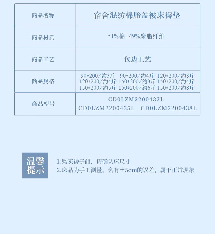 • 商品名称:伊伊爱 宿舍混纺棉胎盖被床褥垫 白色 120*200/4斤/CD0LZM2200435L