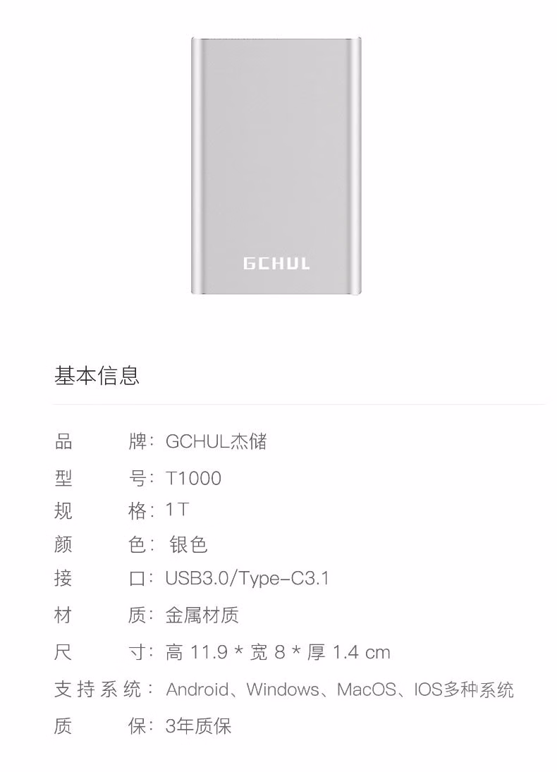 • 商品名称:杰储(GCHUL)T1000 2.5英寸 移动硬盘 (计价单位:个) 银色 1T Type-c3.1