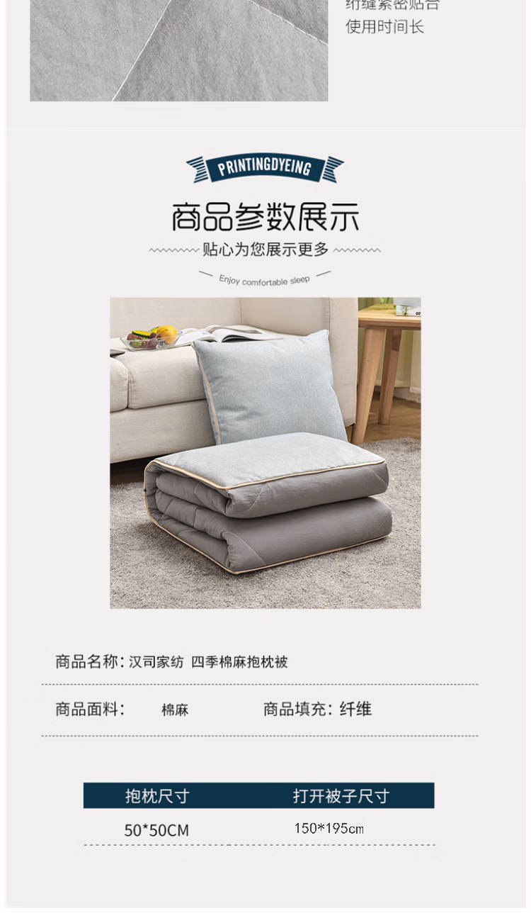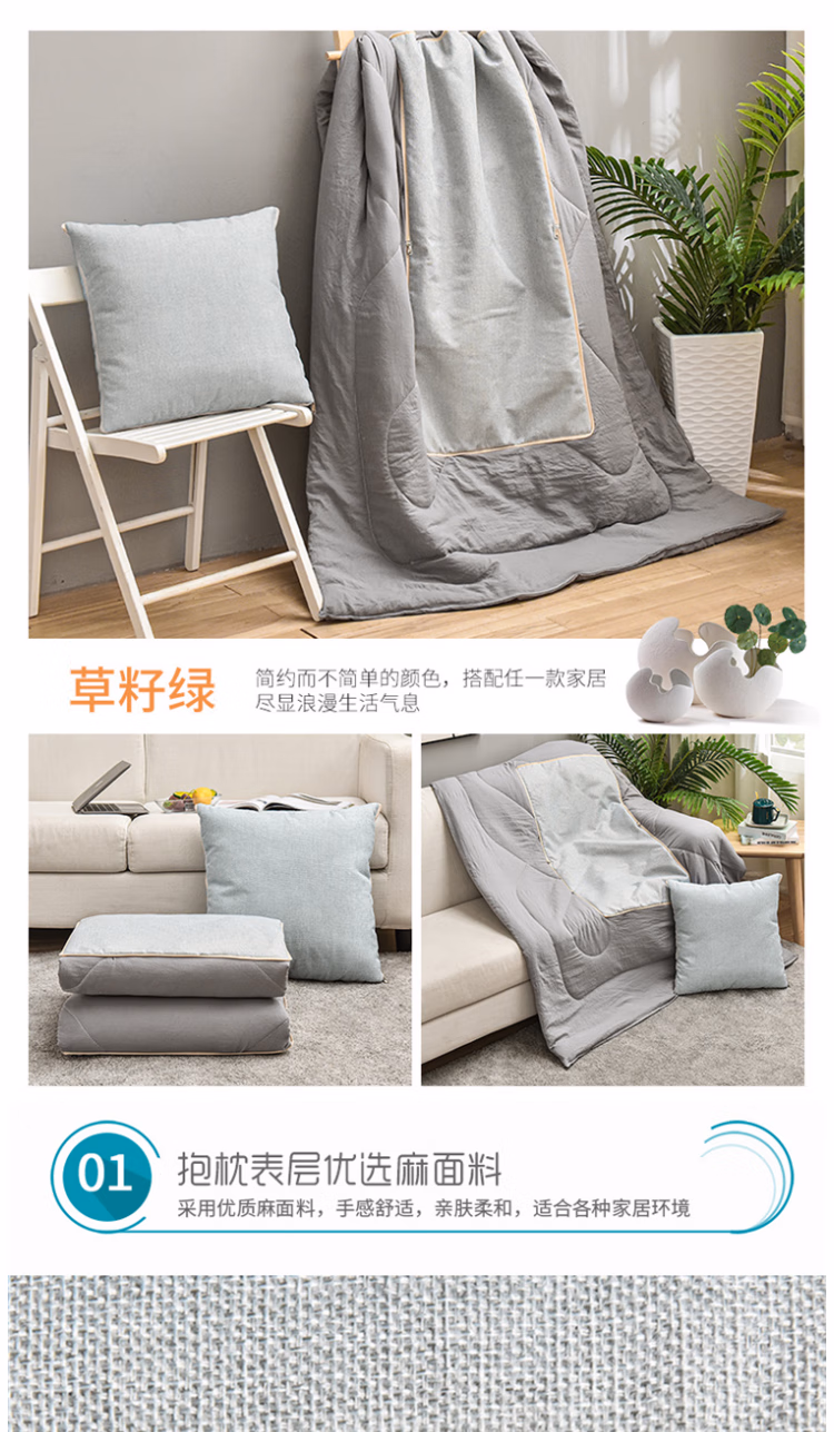 • 商品名称:汉司家纺四季棉麻抱枕被 50*50展开150*195cm (计价单位:件) 草籽绿