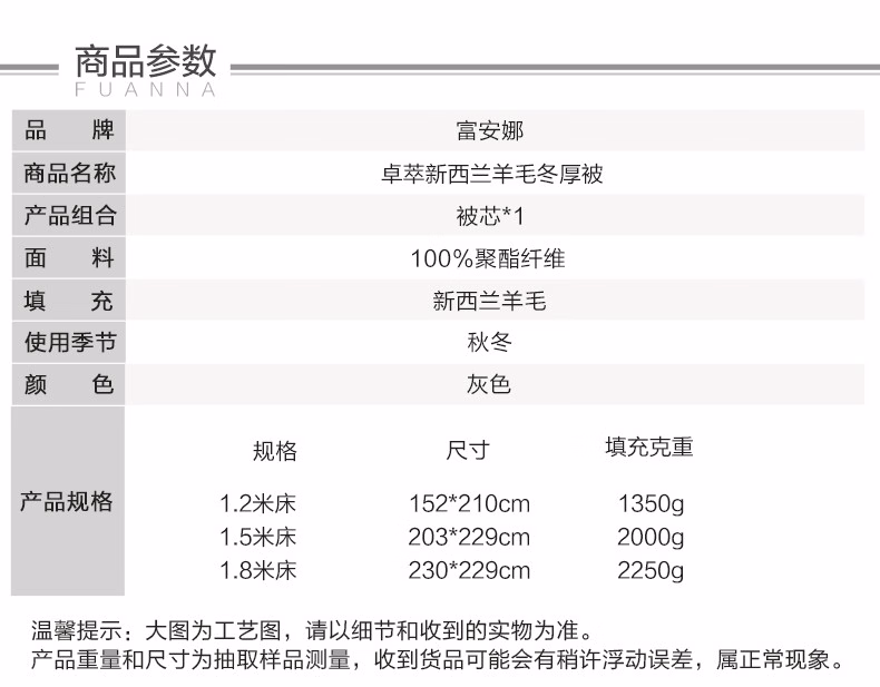 富安娜(FUANNA) 1.8米床230*229cm 富安娜 卓萃新西兰羊毛冬厚被 1.00 件/床 (计价单位:床) 灰色