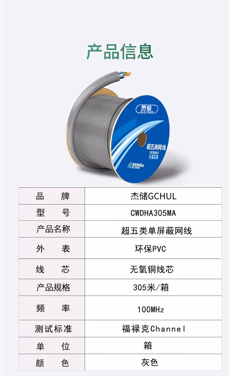 • 商品名称:杰储(GCHUL) CWDHA305MA 超五类单屏蔽网线 305米/箱 (计价单位:箱) 灰色