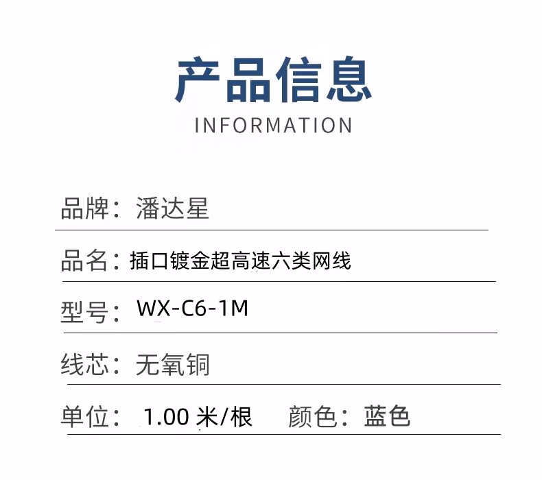 • 商品名称:潘达星WX-C6-1M 插口镀金 超高速六类网线网络线 1.00 米/根 (计价单位:根) 蓝色