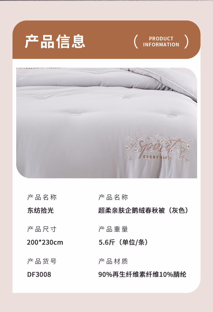 • 商品名称:东纺拾光超柔亲肤企鹅绒春秋被200*230cm 灰色 (单位:条)