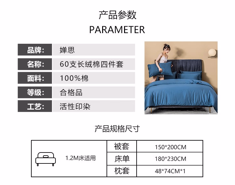 • 商品名称:婵思(CHANSI)60支长绒棉一系列经典三件套 纯色-月光蓝 150*200cm/TJ0WL02100633