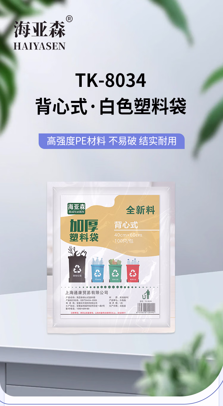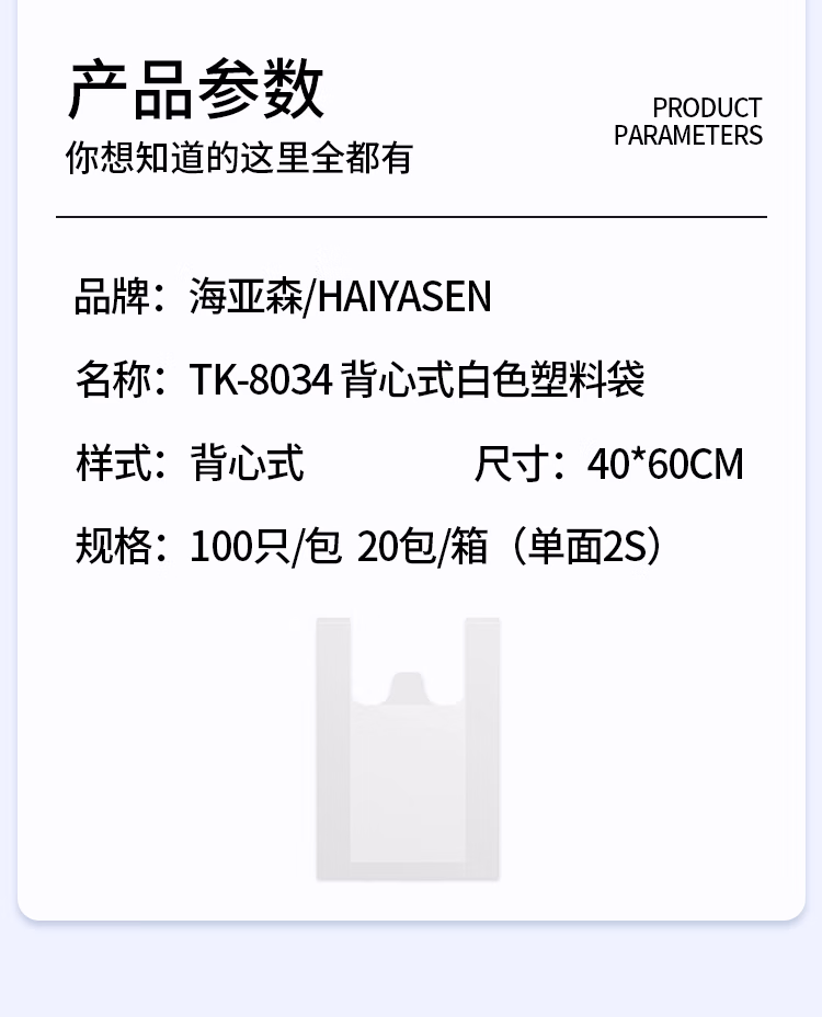 海亚森 TK-8034 加厚型背心式白色塑料袋 背心式 40cm*60cm (白色) 单面2s 100只/包 20包/箱 (单位:包)