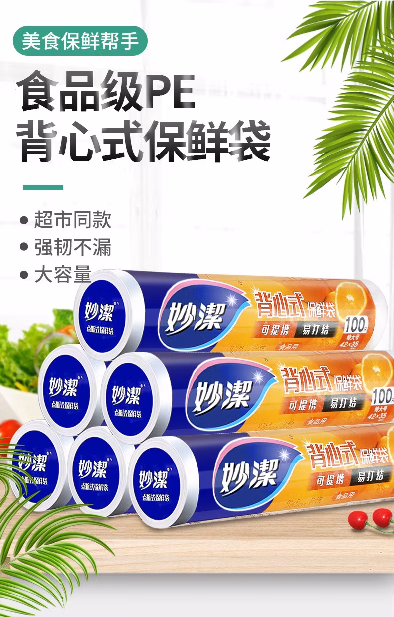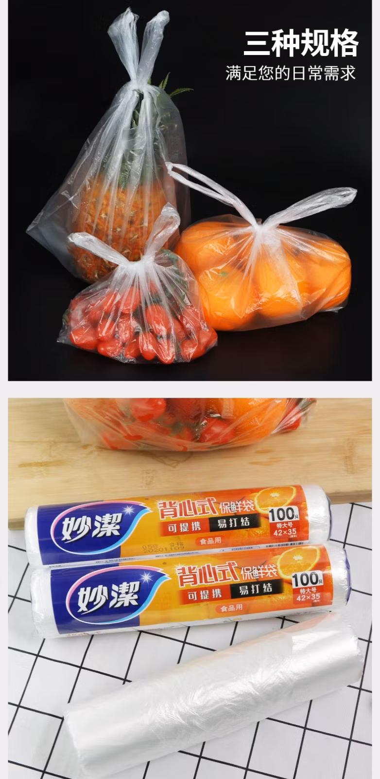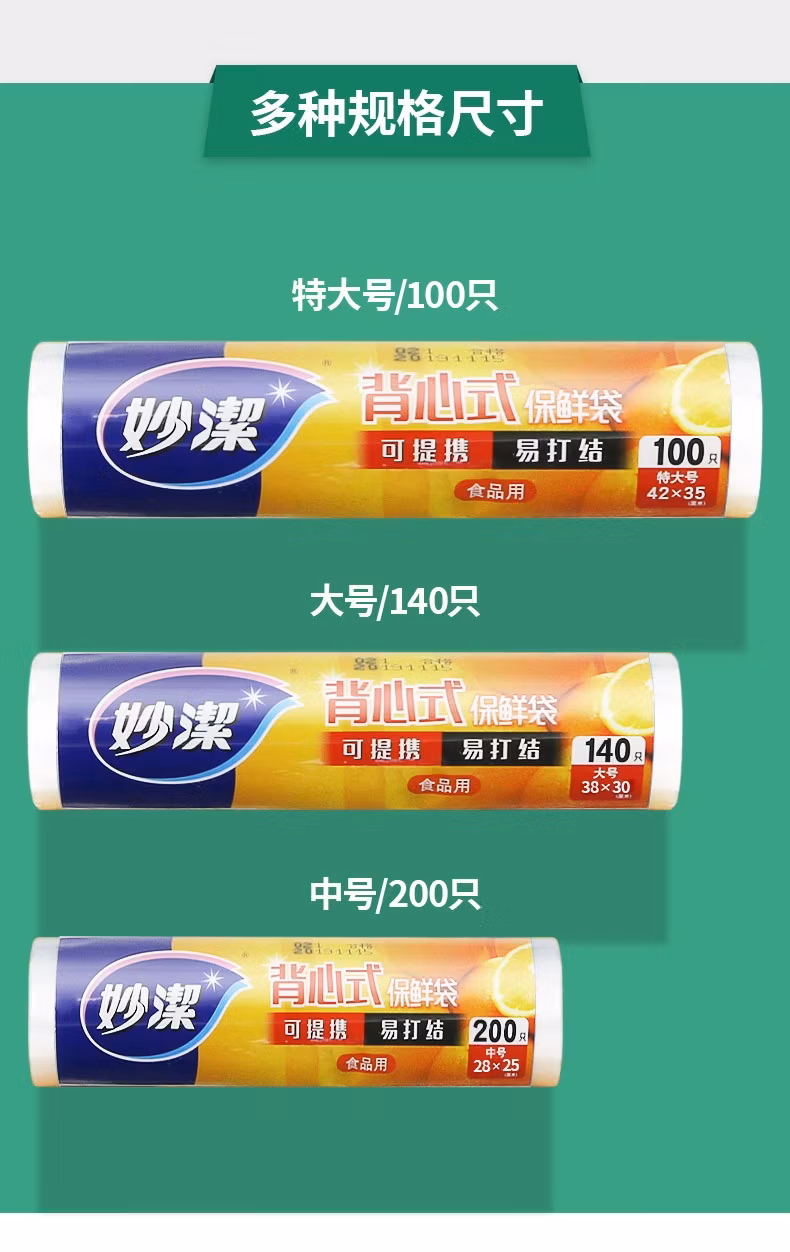 妙洁背心式保鲜袋一次性手提家用食品级耐高温分装食品袋 背心式中号1卷200只 单位:卷
