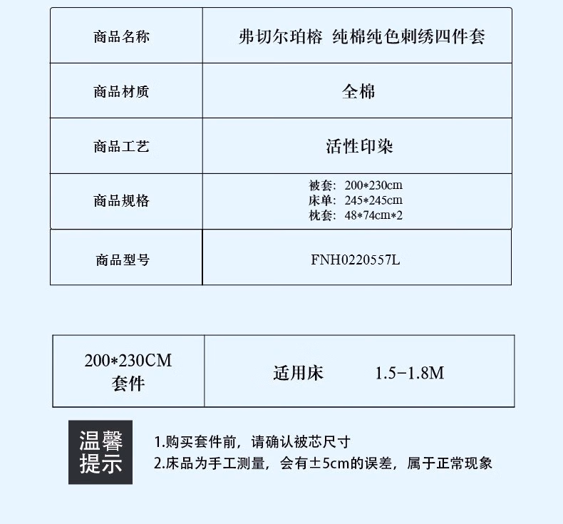 弗切尔珀榕 FNH0220557L 200*230cm 纯棉纯色刺绣初见系列四件套 (计价单位:套) 宾利蓝