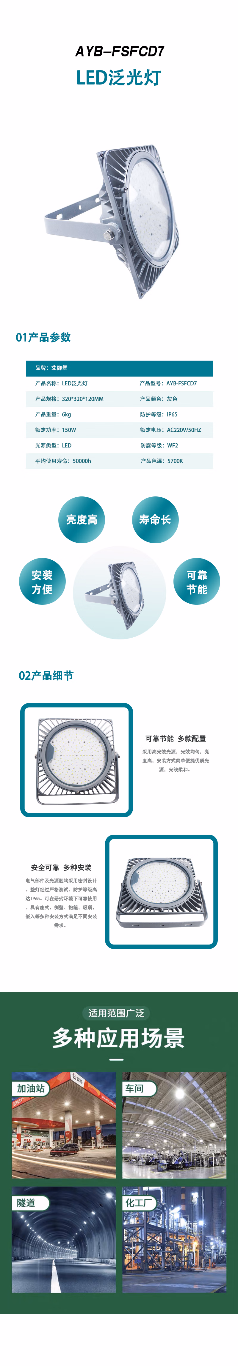 艾御堡 AYB-FSFCD7 IP65 AC220V/50HZ 5700K LED 泛光灯 (计价单位:个) 灰色