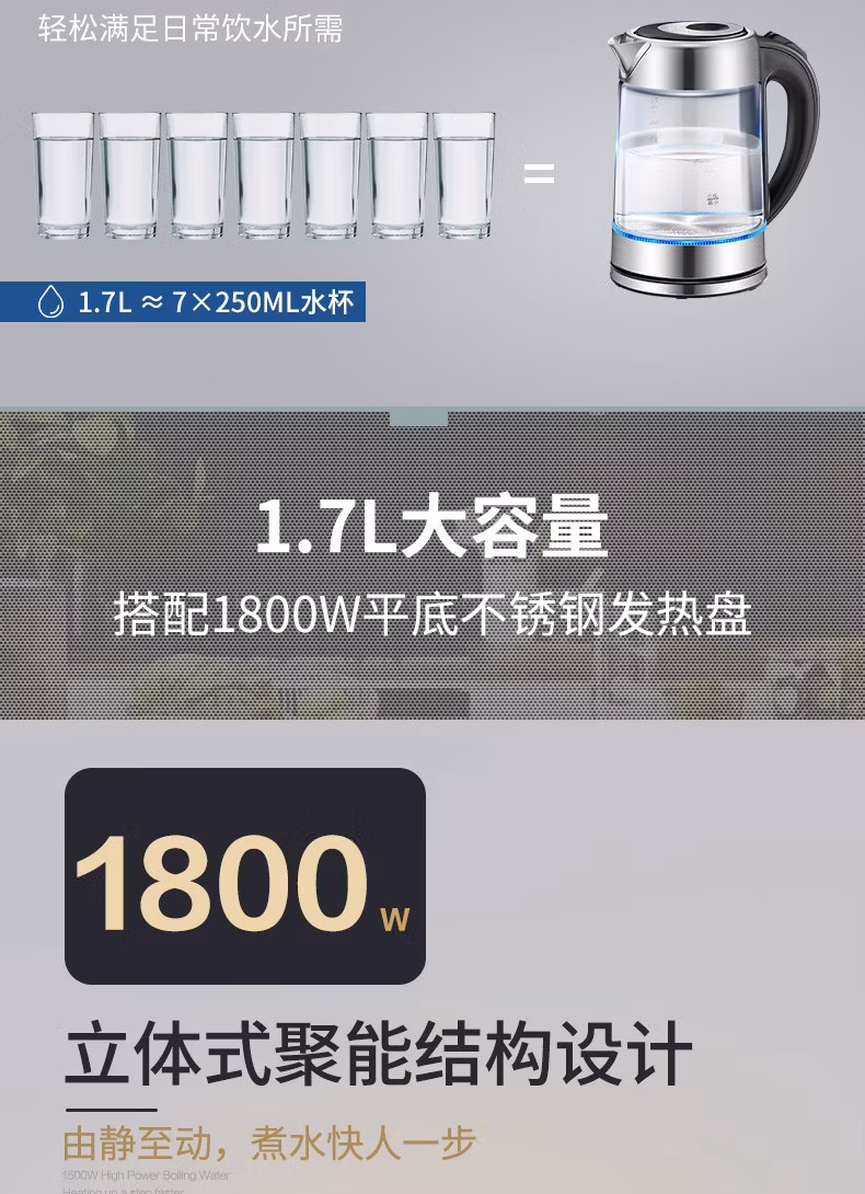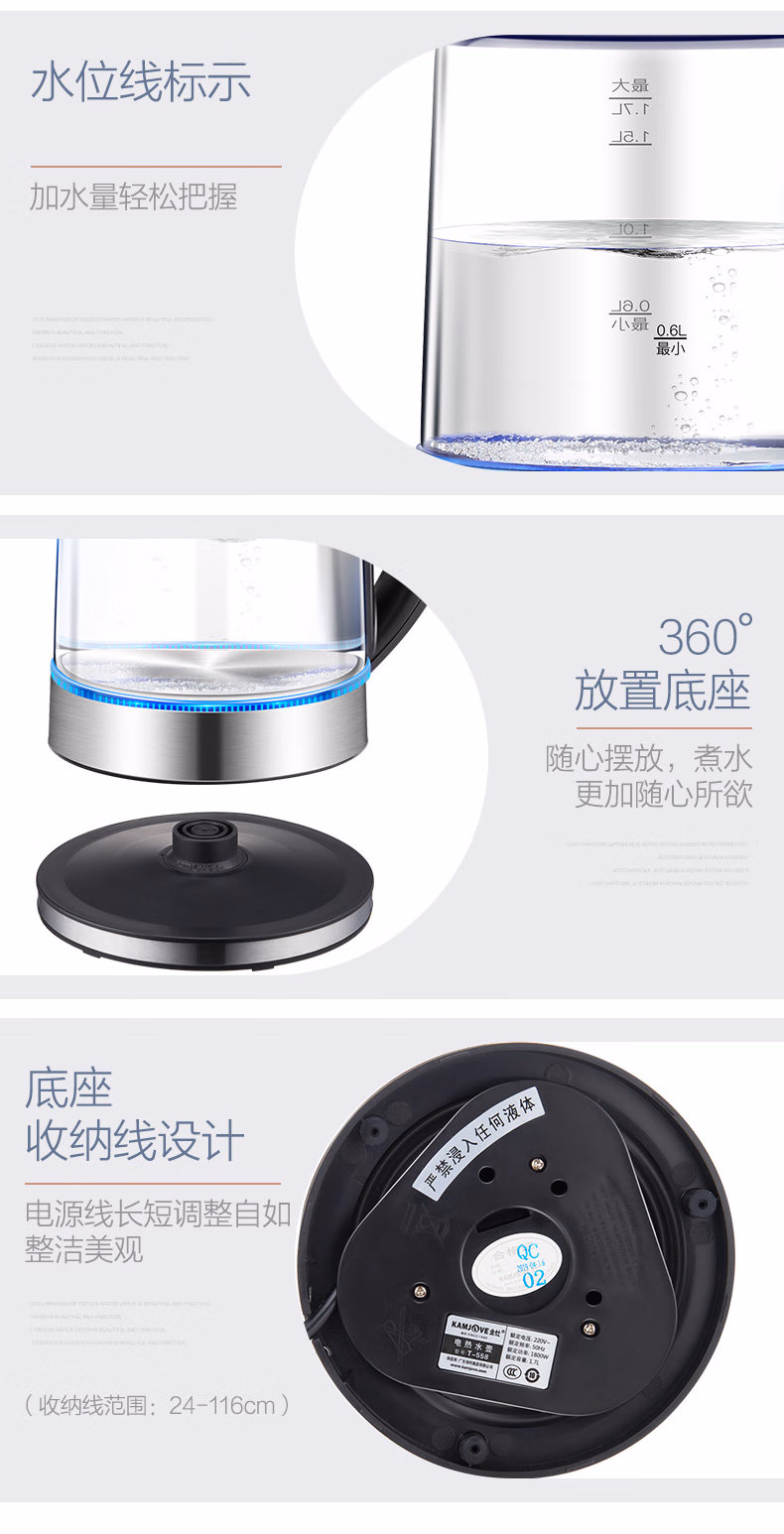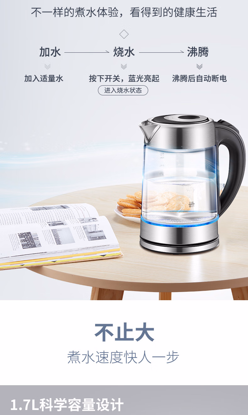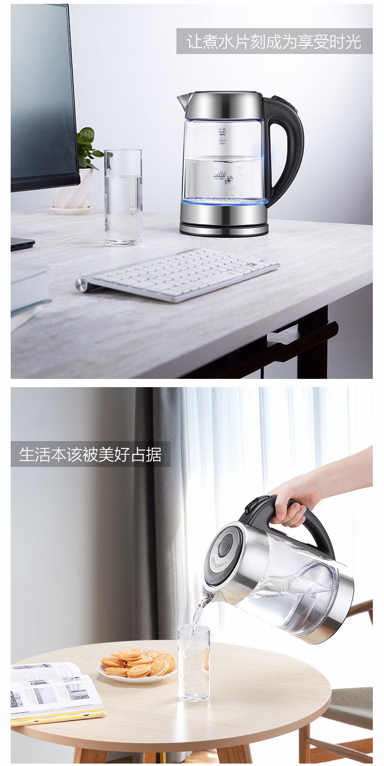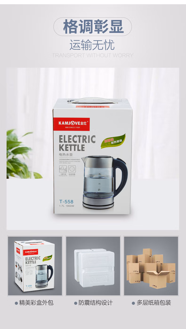 金灶(KAMJ VE) 可视化蓝光玻璃电水壶热水壶家用高硼硅玻璃电热水壶大容量1.7L烧水壶 T-558