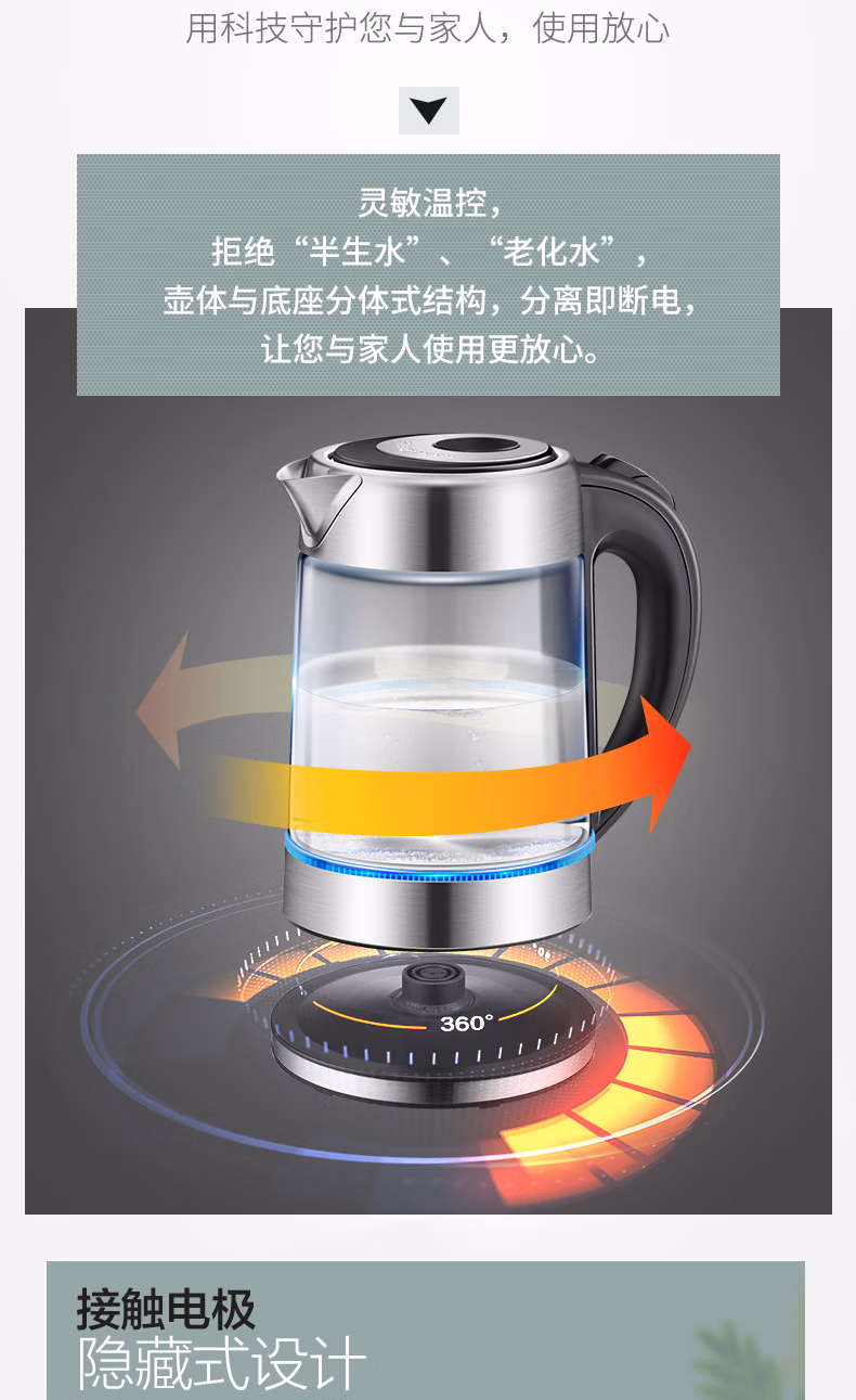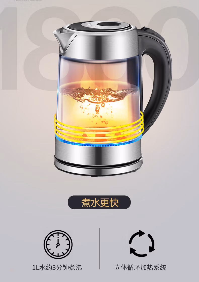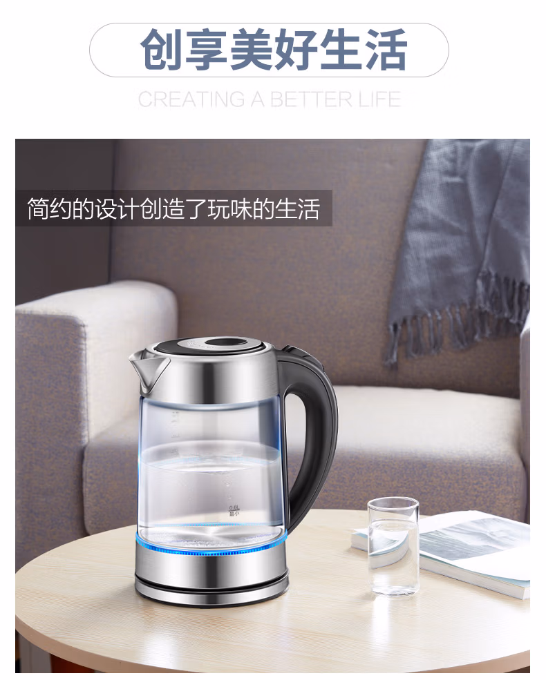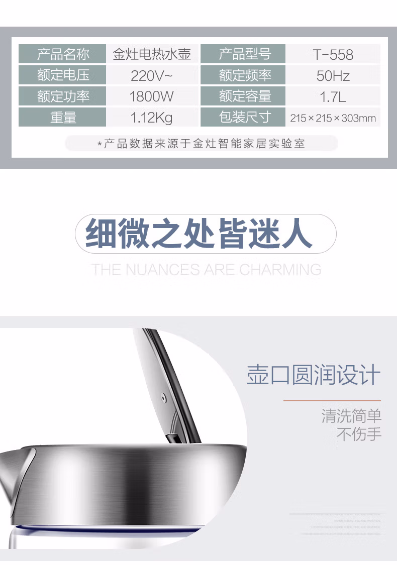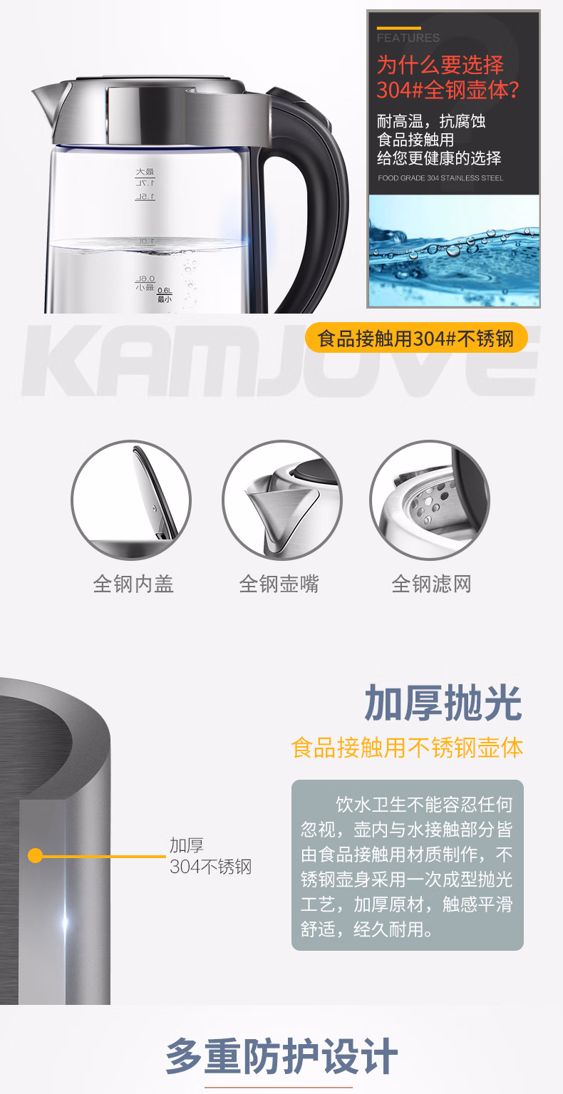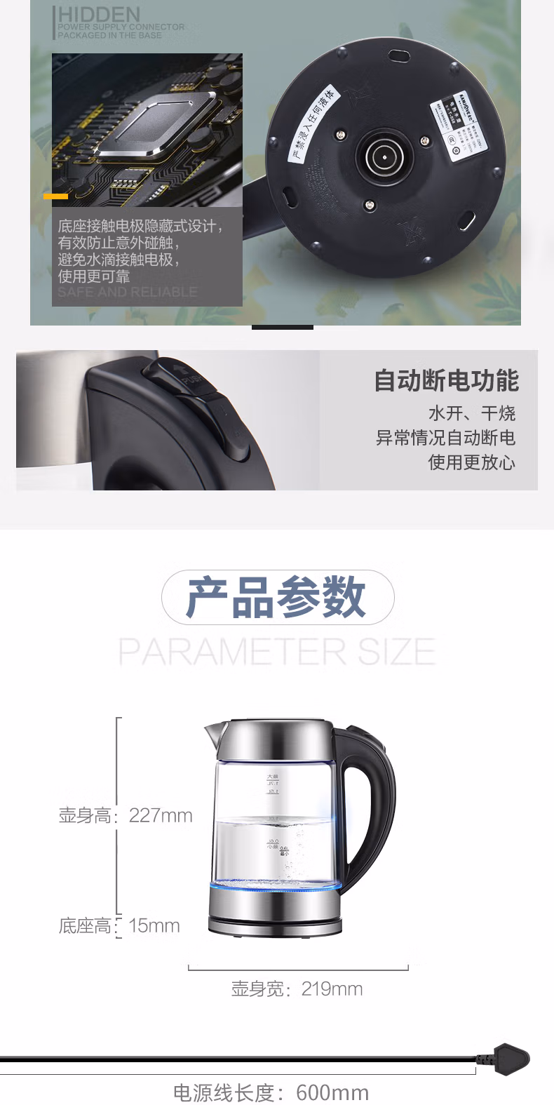 金灶(KAMJ VE) 可视化蓝光玻璃电水壶热水壶家用高硼硅玻璃电热水壶大容量1.7L烧水壶 T-558