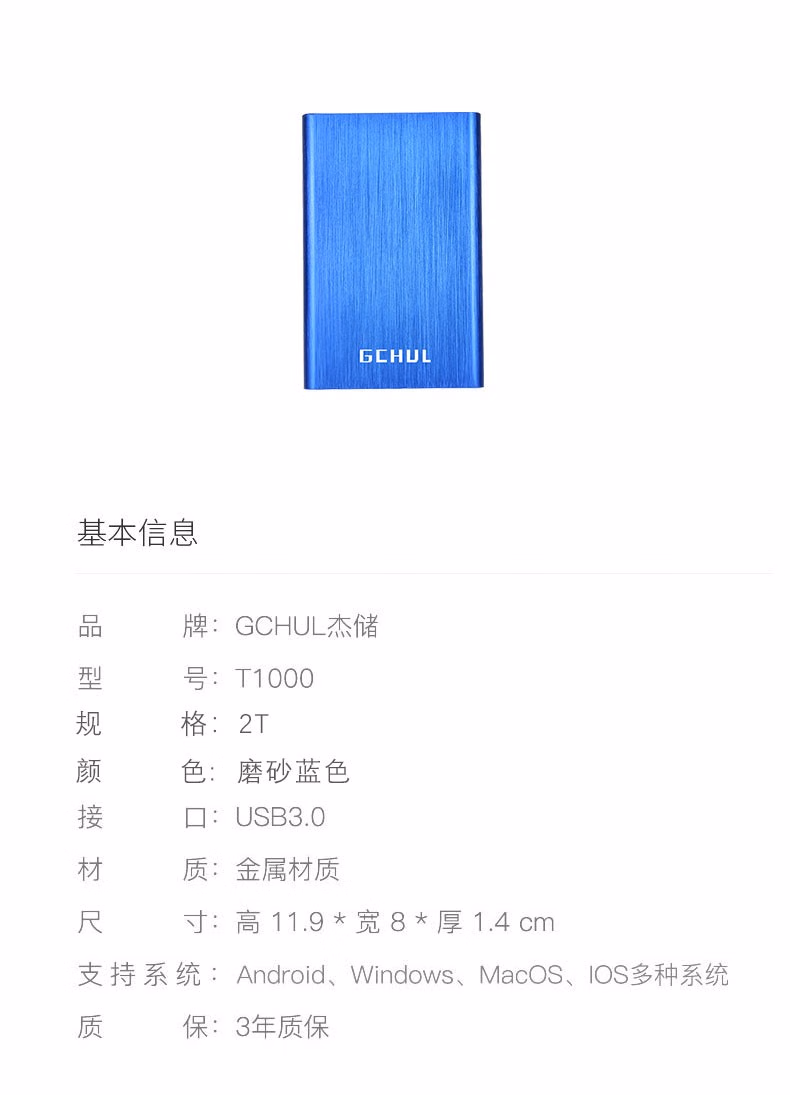 • 商品名称:杰储(GCHUL)T1000 USB3.0 2.5英寸 移动硬盘 磨砂蓝色 2T