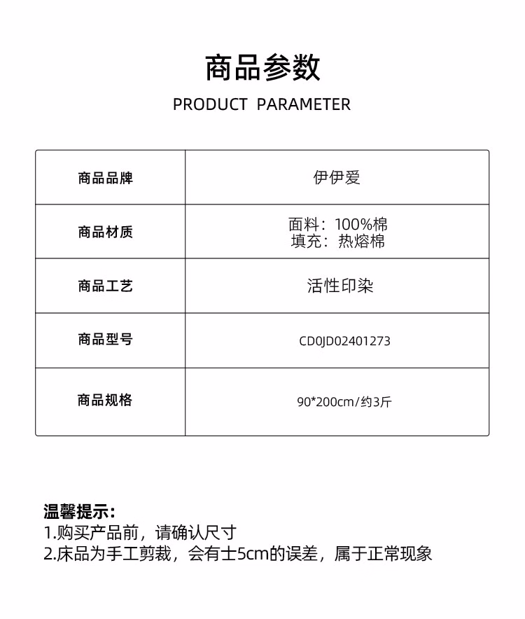 • 商品名称:伊伊爱纯白热熔棉床褥 约3斤 白色 90*200cm/CD0JD02401273