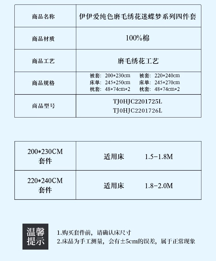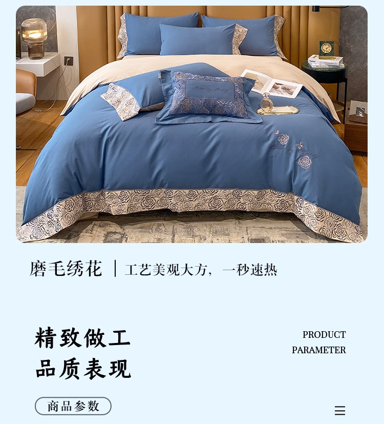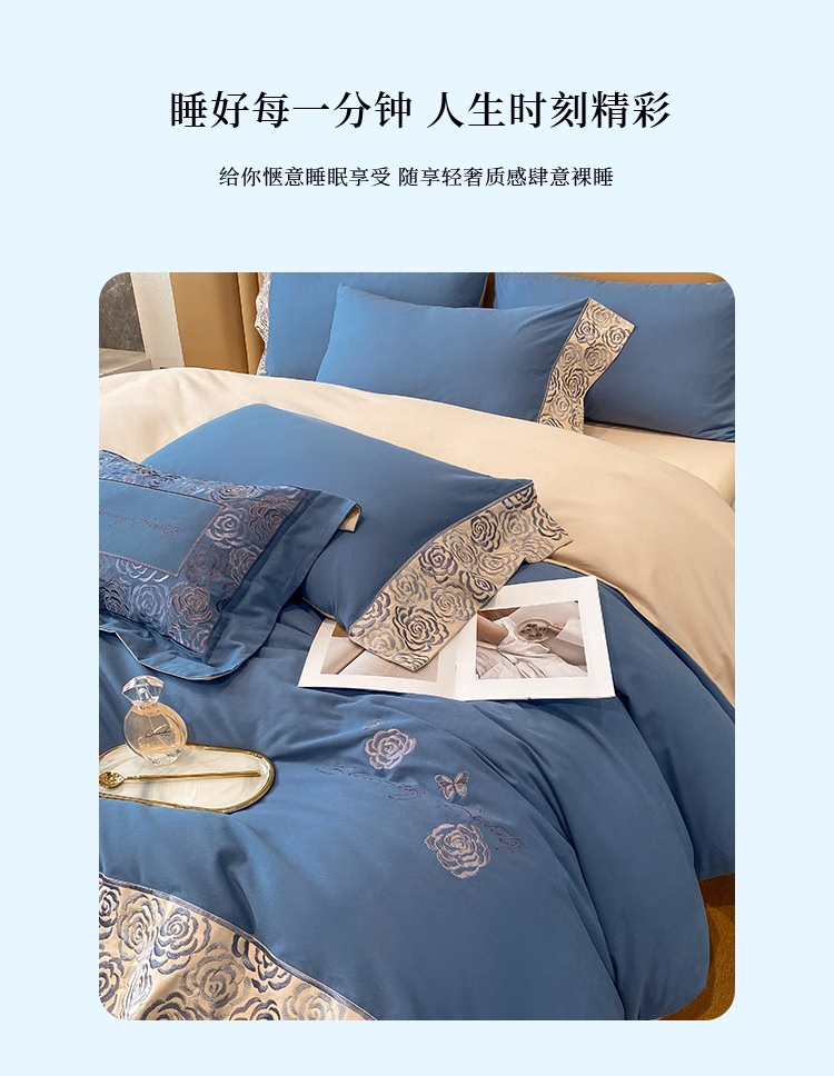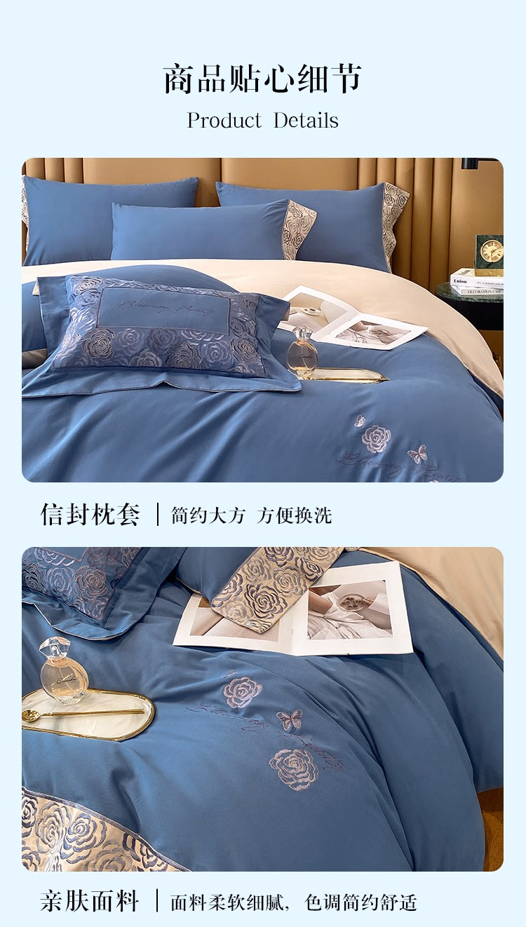 • 商品名称:伊伊爱 纯色磨毛绣花迷蝶梦系列四件套 迷蝶梦(风暴蓝拼耀砂金) 220*240cm/TJ0HJC2201726L
