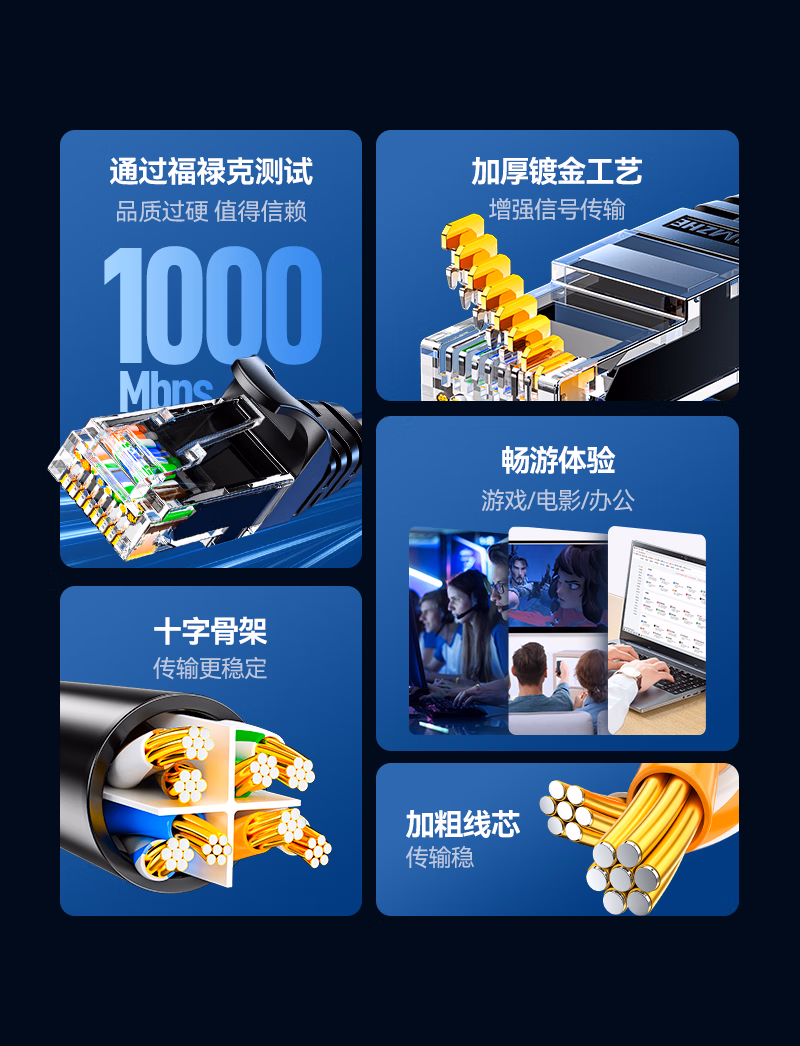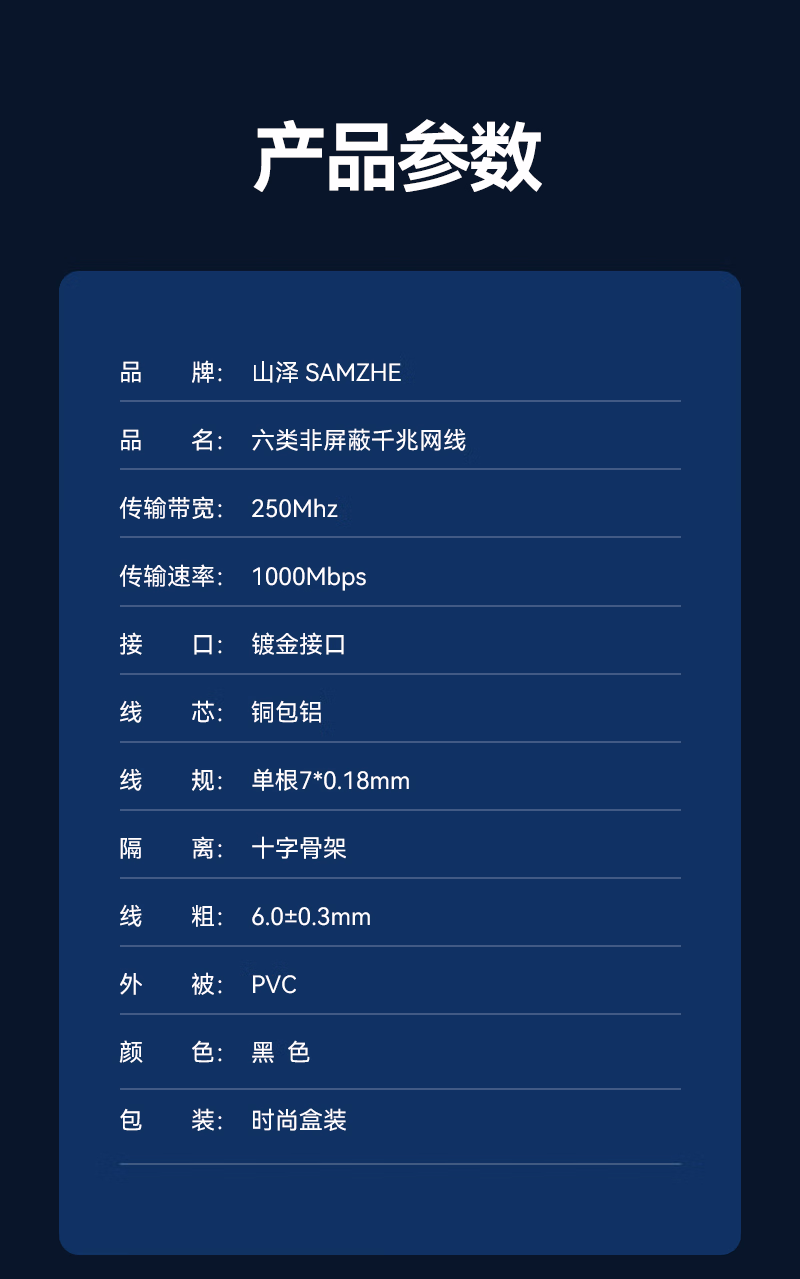 • 商品名称:山泽(SAMZHE) 六类网线CAT6类千兆极速8芯双绞 工程家用电脑宽带监控非屏蔽跳线成品网线 六类圆线-8米 CAH-6080