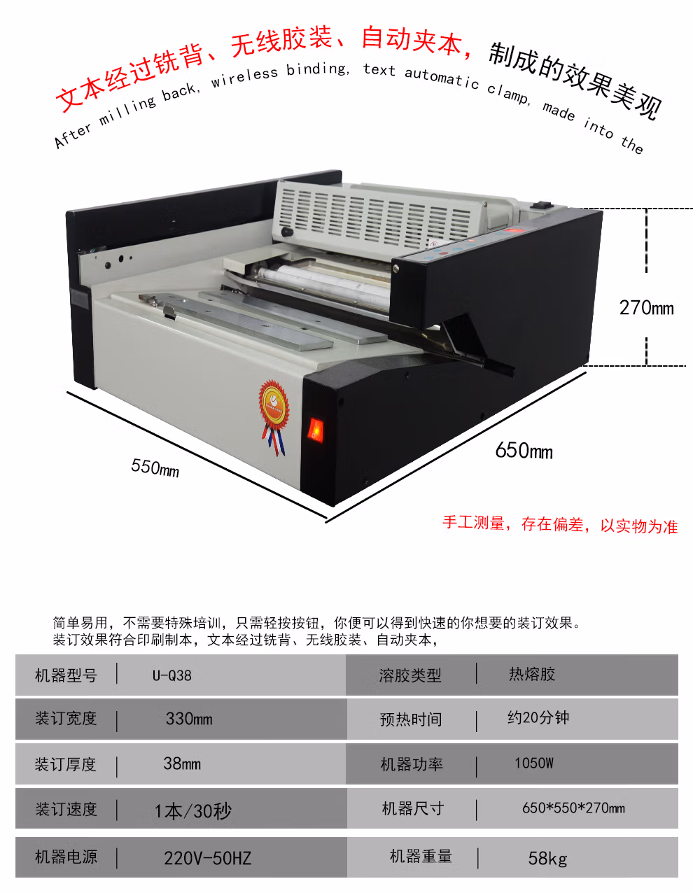 优玛仕(U-MACH) U-380Q 热熔 装订厚度38mm 桌面式 自动 无线胶装机 1.00 个/台 (计价单位:台) 黑白